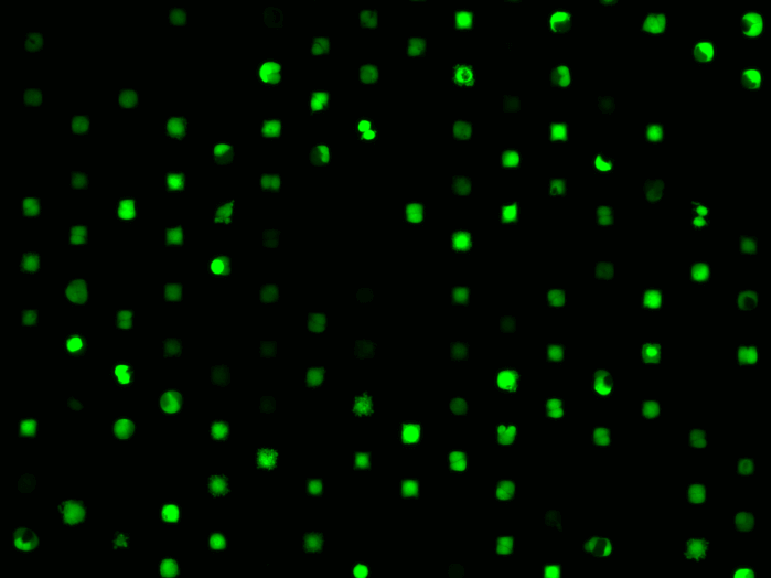 在ibiTreat µ-Pattern (sqr30, pit75)上培養(yǎng)的表達eGFP的Huh7細胞。細胞接種于用層粘連蛋白包被的ibiTreat µ-Pattern表面。圖片由慕尼黑路德維希-馬克西米利安大學的Gerlinde Schwake提供。